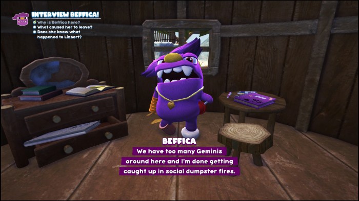 As you begin to bring characters back to Snakburg, the conflicting character relationships and bad pasts arise, and the real comedic gold starts to show. The feud between farmer Wumpus (voiced by Fred Tatasciore) and Bugsnax lover Gramble (voiced by Sam Riegel) is great, Wiggle’s (voiced by Kenna Ramsey) big musical bouts are great and the one she has before a giant boss battle was hilarious, the will they/won’t they romance and brain and brawn connection between Snorpy (voiced by Roger Craig Smith) and Chandlo (voiced by Yuri Lowenthal) is incredibly adorable, Beffica’s (voiced by Cassandra Lee Morris) need for you to find some hot and juicy gossip leads to some late night hilarity, and Filbo instantly warms your heart with his caring mindset and clumsy demeanor. The voice cast nails all of the great dialogue between characters and Bugsnax also contains a surprisingly good amount of LGBTQ+ representation. These representations leave such a surprisingly strong impact and really warm your heart with how the game allows their stories to feel fleshed out.
