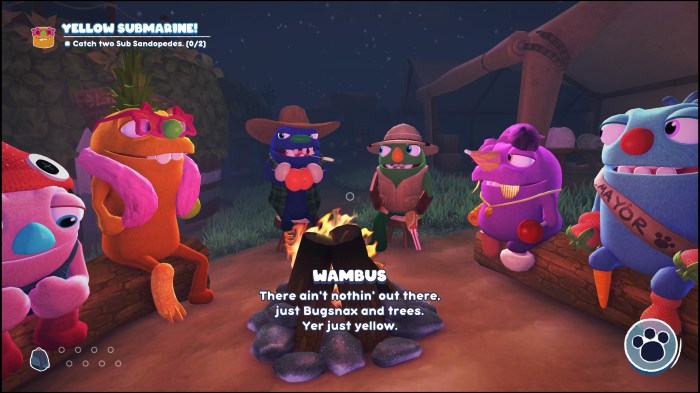 Young Horses has always been about creating games for both kids and adults and exuding “empathy and good humor for all” – at least as their website says. Bugsnax is a pure embodiment of this goal as its aesthetics and designs are ripped straight out of a children’s cartoon, with its own playful theme song, mixed with their own brand of charming humor with a slight edge. Honestly, after seeing it in Fall Guys and Bugsnax, I’m really starting to dig the FMOD engine and Young Horses puts it to good use into creating the game’s characters. Grumps, the game’s main species of characters, basically look like multi-colored walking, talking walruses with incredibly adorable designed matched with colorful personalities. Although they spew some of Young Horses mordern comedic charm, the characters’ looks give off that educational kids show vibe with Elizabert being the adventurous host, Filbo being the clumsy comic relief, and other characters fulfilling roles like the farmer, archeologist, scientist, and pop superstar.