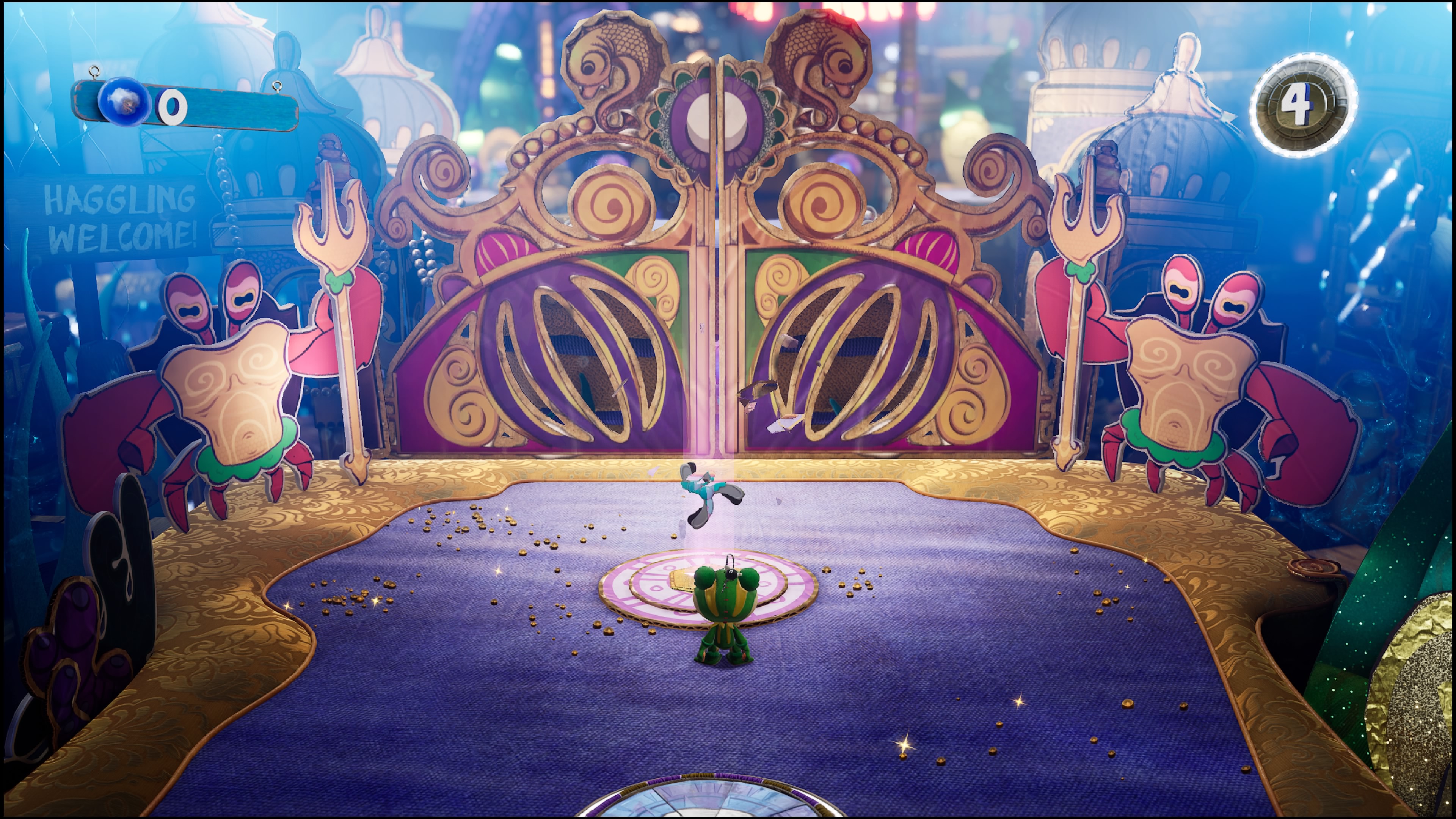 Vex is an incredibly lively and fun villains whose great voice work from Grant and cartoonish, jester personality makes him very memorable. Sackboy has a new companion in the form of experienced adventurer and narrator Scarlet (voiced by Dawn French) whose whimsical sense of adventure drives your forward and has you meet some other wild characters along the way. Each uniquely designed area features a “Creator Curator” that fits to their respective area and comes with some funny, quirky personality traits that set them apart. Characters like King Bogoff (voiced by Lewis Macleod), a crown wearing crab attempts to sell knick-knacks and treasures within The Kingdom of Crablantis, Mama Monkey (voiced by Eve Karpf), who tries to keep her little monkey’s in order while residing in the thick jungles of the Colossal Canopy, and N.A.O.M.I. (voiced by Susannah Fielding), a robot guide through the futuristic Interstellar Junction that has some hilariously dark sides to herself, add some fun personalities to the adventure that constantly give the experience a spark.